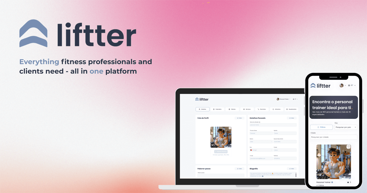 Completa o teu perfil e começa a aparecer para mais clientes! Na Liftter, quanto mais completo estiver o teu perfil, mais visibilidade ganhas. Adiciona foto, biografia, especialidades e certificações. Perfis completos transmitem confiança e surgem no topo das pesquisas. Em poucos minutos, podes atrair mais alunos e destacar o teu trabalho.